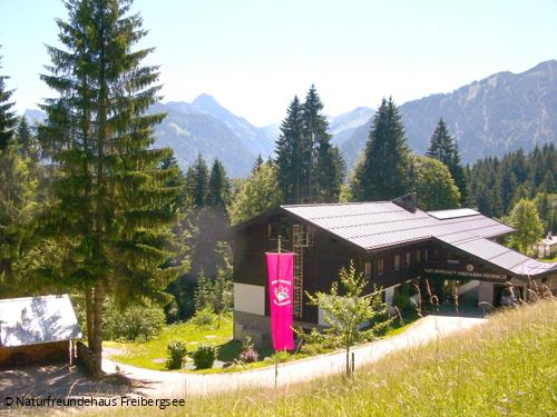 Das Haus Freibergsee liegt auf gut 1.000 Meter Höhe umrahmt von Rubihorn, Nebelhorn, Fellhorn und Söllereck mitten im Landschaftsschutzgebiet. Nur die Hüttenwirtschaft hat eine Ausnahmegenehmigung und darf für die Versorgung mit Lebensmitteln oder für Sammeltransporte von Gästegepäck mit dem Auto direkt bis zum Haus fahren. In den Augen von Brigitte reisen Gäste oft mit zu viel Gepäck an. „Gerade junge Menschen sind häufig mit einem großen Rollkoffer unterwegs, obwohl der Rucksack für eine Wanderreise ausreicht“, sagt sie. Brigitte gehört zum Bundeslehrteam Wandern und bietet in Oberstdorf auch Fortbildungen für Wanderleiter* innen an.