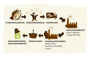 Nicht alle kakaoverarbeitenden Unternehmen verarbeiten den Rohkakao bis zur fertigen Schokolade, viele verkaufen Halbfabrikate wie Kakaomasse, Kakaopulver oder Kakaobutter und stellen selbst gar keine Schokolade her. Um die Herstellung kümmert sich das nächste Glied in der Produktionskette, der Süßwarenhersteller. Dazu gehören bekannte Konzerne wie Mars, Nestlé und Ferrero.